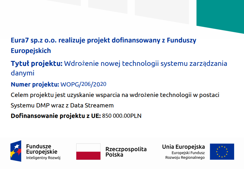 Firma Eura7 Sp. z o.o. uczestniczy w projekcie realizowanym przez Województwo Małopolskie – Małopolskie Centrum Przedsiębiorczości "Małopolska Tarcza Antykryzysowa – pakiet przedsiębiorczość", którego celem jest udzielenie wsparcia poszkodowanym przez COVID-19 przedsiębiorcom z sektora MŚP z województwa małopolskiego.